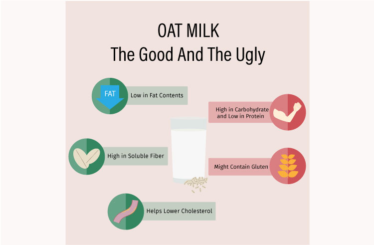 Oat milk is one great source of soluble fiber that can help reduce infection and lower bad cholesterol, it is also very low in fat contents as the milk is made from grain. Unlike other types of plant based milk that is made from nuts, oats milk doesn't really create allergic reaction unless it is not identified as gluten free which can cause intolerance in some people. The down side of consuming oat milk is that it doesn't contains much of minerals and protein as other types of nuts or cow's milk.